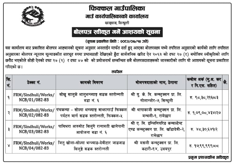 ॥ बोलपत्र स्वीकृत गर्ने आशयको सूचना ॥