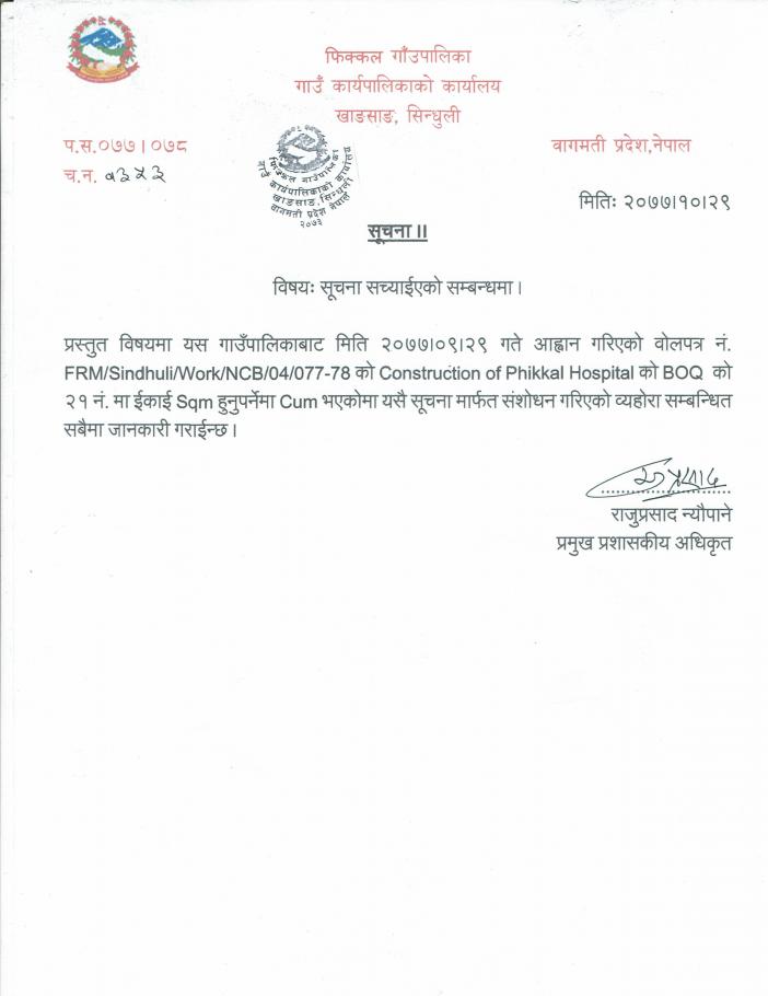 वोलपत्रको सूचना सच्याईएको सम्बन्धमा ।