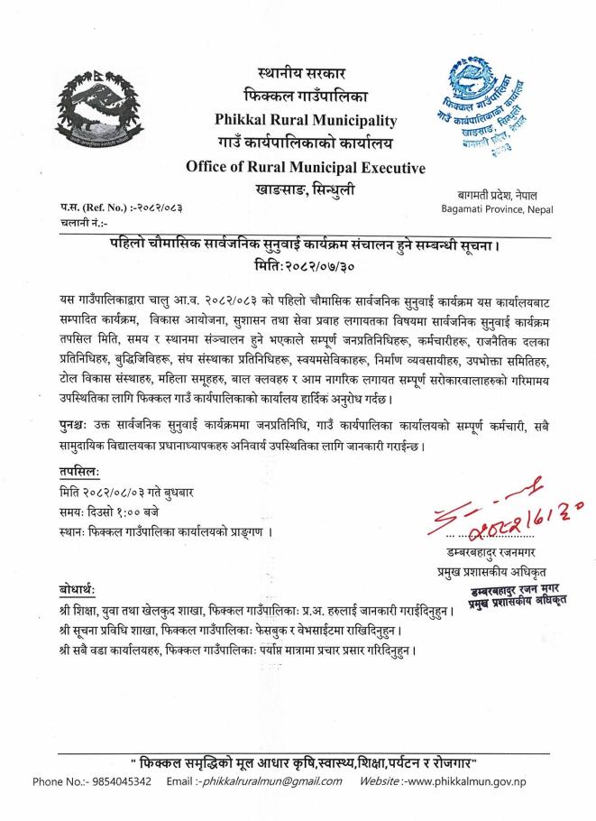 Home » ॥ आ.व. २०८२/०८३ को पहिलो चौमासिक सार्वजनिक सुनुवाई कार्यक्रम सञ्चालन हुने सम्बन्धी सूचना ॥